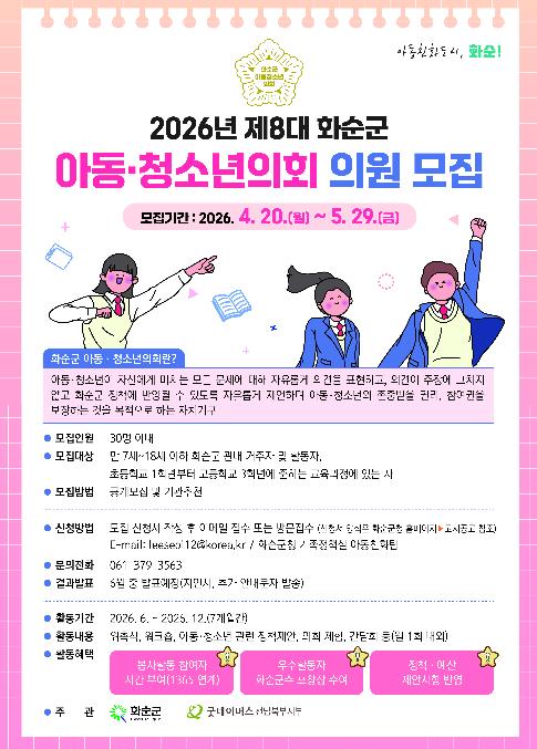 [시사토픽뉴스]화순군은 ‘2026년 제8대 화순군 아동·청소년의회’ 의원 30명을 오는 4월 20일부터 5월 29일까지 공개 모집한다고 밝혔다.