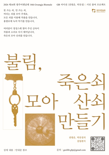 광주시는 이번 프로젝트의 시민 참여 확대를 위해 지난 10일부터 시청 1층에 금속 수집함을 비치, 오는 5월 말까지 운영한다. 수집 대상은 전선, 열쇠, 놋그릇, 냄비, 캔 등 다양한 금속류다. 참여자에게는 비엔날레전시장 내 ‘불림’ 작품 인근에 이름을 표기하고, 제작된 작품 음원 등을 제공할 예정이다.