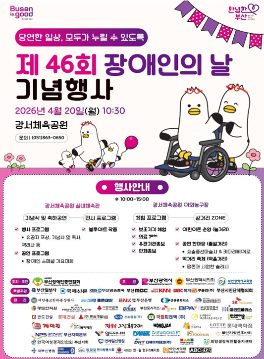 [시사토픽뉴스] 부산시는 오늘(20일) 오전 10시 30분, 강서체육공원 실내체육관에서 장애인에 대한 이해를 높이고 장애인과 비장애인이 함께 공감하는 장을 마련하기 위해 '제46회 장애인의 날 기념행사'를 개최한다고 밝혔다.