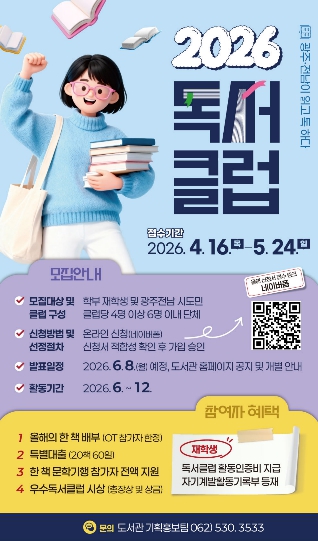 [시사토픽뉴스] 전남대학교가 지역사회 내 책 읽는 문화를 확산하고 공동체 소통을 활성화하기 위해 오는 5월 24일(일)까지 ‘2026 독서클럽’ 참여자를 모집한다.