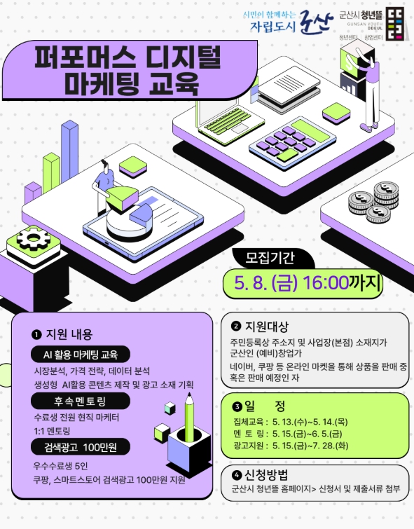 [시사토픽뉴스] 군산시 청년뜰 창업센터가 4월 20일부터 5월 8일까지 지역 온라인 창업가의 디지털 마케팅 역량 강화를 위한 '2026년 퍼포먼스 디지털 마케팅 교육' 참여자를 모집한다.