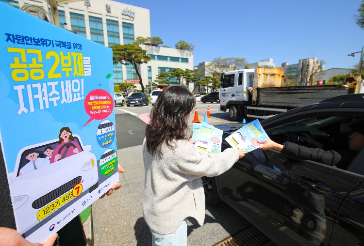 유성구청 직원이 구청 출입 차량에 공공2부제 홍보물을 배부하고 있다.