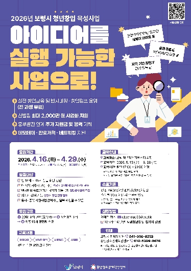 신청은 4월 29일 16시까지 이메일을 통해 접수할 수 있으며, 교육은 5월 중순부터 보령시 청년창업지원센터에서 진행될 예정이다.