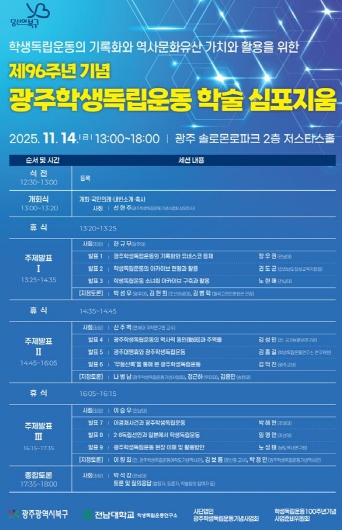 [시사토픽뉴스]광주광역시 북구가 오는 14일 광주 솔로몬로파크 저스티스홀에서 ‘학생독립운동 96주년 기념 학술 심포지엄’을 개최한다고 13일 밝혔다.