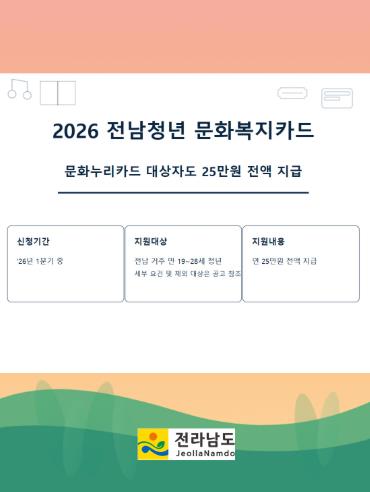 [시사토픽뉴스]전라남도는 2026년부터 전남 청년 문화복지카드 사업 추진 시 경제적 취약 계층(기초생활수급자·차상위계층)이 수혜를 받는 문화누리카드 지급자에게도 25만 원 전액을 지급한다고 밝혔다.